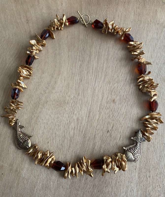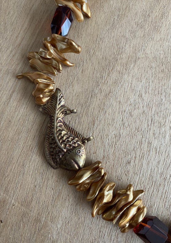 Vintage ketting met handgemaakte koperen vissen uit Indonesië